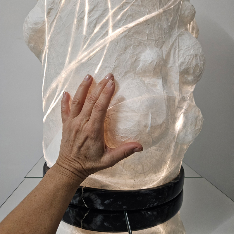 Der TREE of LIGHT erhebt sich wie ein Lebewesen – eine organische Skulptur aus handgeschöpfter Strohseide, hergestellt aus den feinen Fasern des Maulbeerbaums. Von einem zylindrischen Stamm aus winden sich halbkugelförmige Formen unterschiedlicher Größe spiralförmig nach oben, deren Oberflächen von zarten Lichtlinien durchzogen sind. Sie laufen in einer leuchtenden Kuppel wie in einer Krone zusammen. Jede Kontur trägt die Spuren der Hand, die sie erschaffen hat, eine Unvollkommenheit, die die perfekte Unregelmäßigkeit der Natur widerspiegelt. Das zarte Licht zeigt sich mal klar konturiert, mal diffus gestreut und findet sich gut eingebettet zwischen den Lagen von Strohseide.