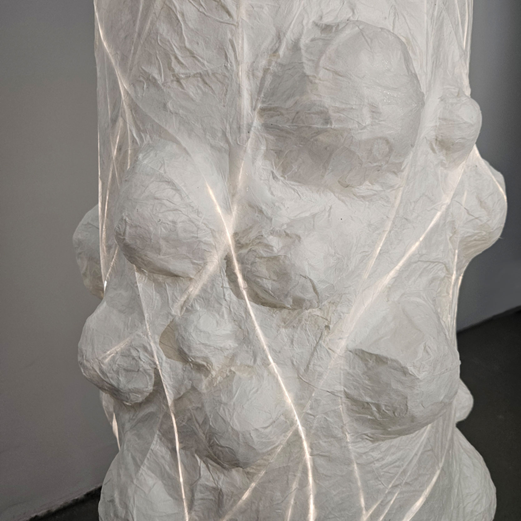 Damit das Licht so organisch aus dem Sockel emporwachsen kann, werden die Lichtleiter einzeln zunächst manuell so bearbeitet, dass sie ihr Licht inhomogen über die Seite abstrahlen. Anschließend werden die Lichtleiter drapiert und von Hand in der gewünschten Position zwischen den Lagen der Strohseide fixiert. Je mehr das Licht im Raum abnimmt, desto sichtbarer werden die Lichtlinien.