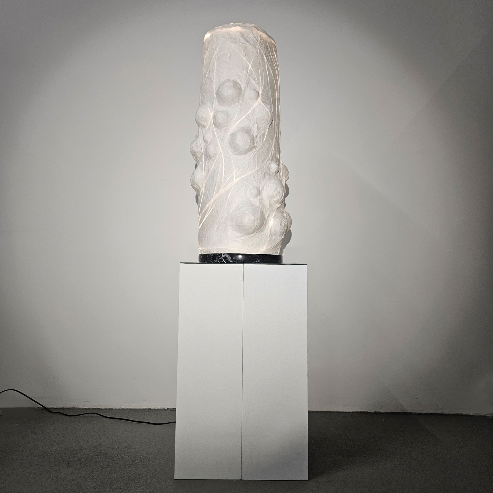 Ein schlanker Marmorsockel verankert das Werk und verbirgt die Lichtquelle. Der Betrachter wird dazu verleitet, es zu umkreisen – dem Licht, der Form und der spiralförmigen Bewegung folgend, in eine ruhige, poetische Atmosphäre, in der das Wesentliche nicht im Zentrum liegt, sondern im Rand, im Dazwischen, im peripheren Erleben des Raums.